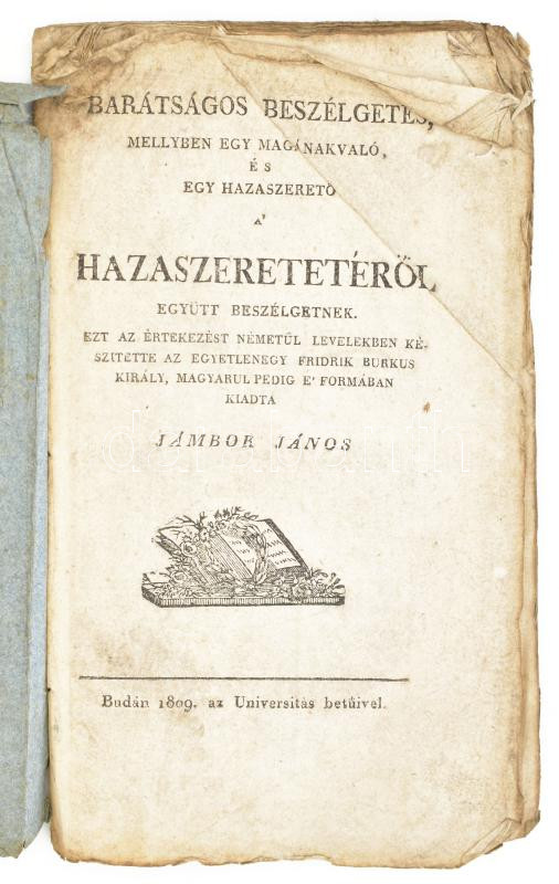 Barátságos beszélgetés, melyben egy magának való és egy hazaszerető a hazaszeretetéről együtt beszélgetnek. Ezt az értekezést németül levelekben készítette az egyetlenegy Fridrik burkus király, magyarul pedig e formában kiadta Jámbor János. Budán, 1809, az Universitas betűivel. 43p. Ajánlva nyomtatottan gróf Brunsvik József főtábornok-mesternek, Nógrádmegye főispánjának. Sérült papírborítóban, kissé sérült címlappal, helyenként kissé sérült lapokkal. Ritka!