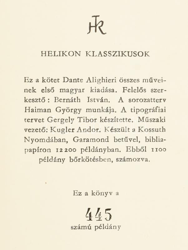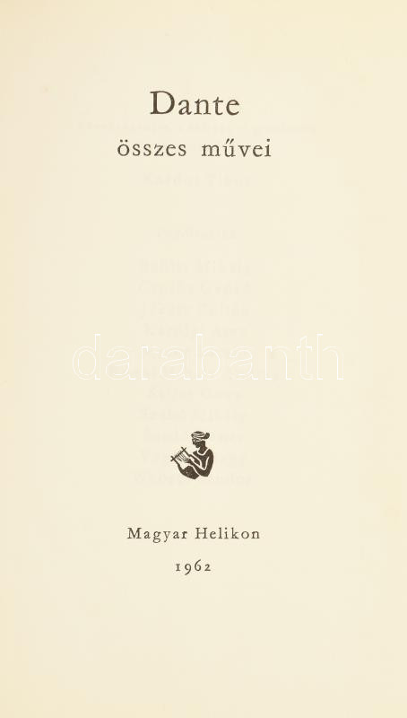 Dante összes művei. Szerk., a szöveget gondozta és az utószót írta: Kardos Tibor. Fordították Babits Mihály, Károlyi Amy, Weöres Sándor és mások. Helikon Klasszikusok. Bp., 1962., Magyar Helikon. Kiadói egészbőr-kötésben, kiadói átlátszó műanyag védőborítóban, kissé foltos, kissé kopott borítóval. Számozott (445./1100) példány.