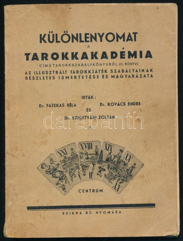 Fazekas Béla - Kovács Endre - Szigetvári Zoltán: Különlenyomat a Tarokkakadémia című tarokkszabálykönyvből (II. könyv). Az illusztrált tarokkjáték szabályainak részletes ismertetése és magyarázata. Bp., [1948], Centrum (Szikra-ny.), 144 p. Kiadói papírkötés, kissé foltos borítóval. A könyv egyik szerzője, Dr. Kovács Endre által DEDIKÁLT példány.