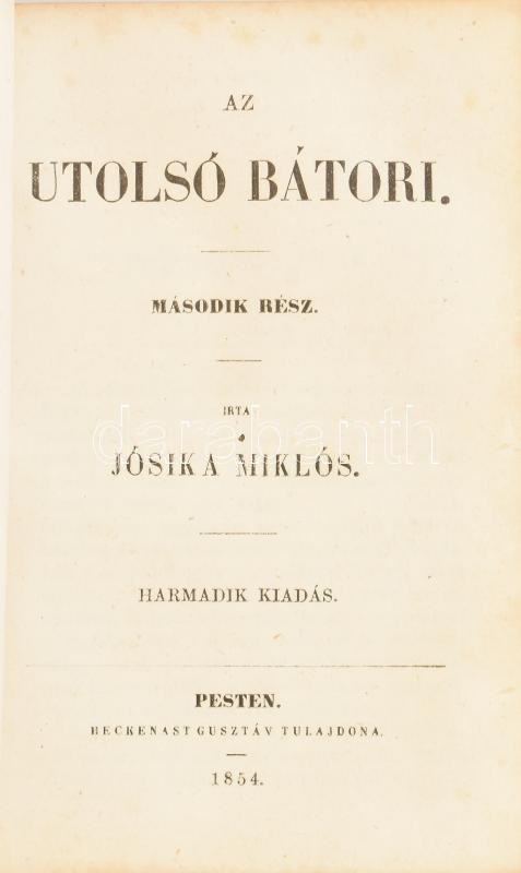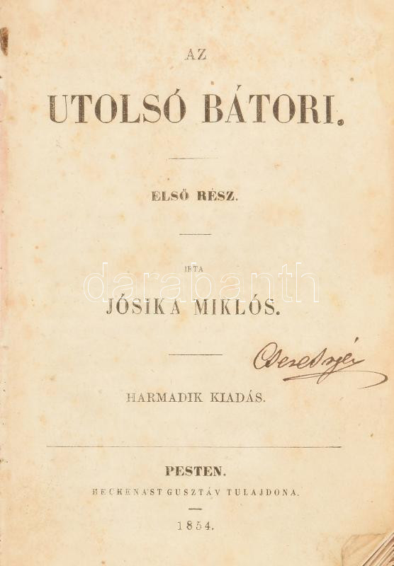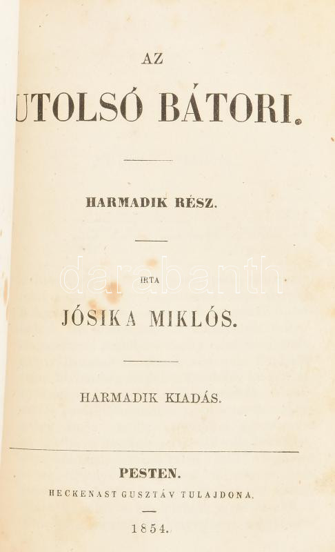 Jósika Miklós: Az utolsó Bátori I-III. rész. Pest, 1854., Heckenast Gusztáv, 218+2; 217+1; 233+1 p. Harmadik kiadás. Korabeli átkötött félvászon-kötés, kopott borítóval, sérült gerinccel, az elülső táblán sérülésnyommal, foltos lapokkal.