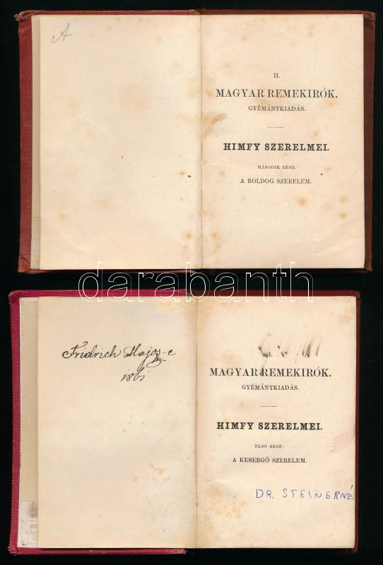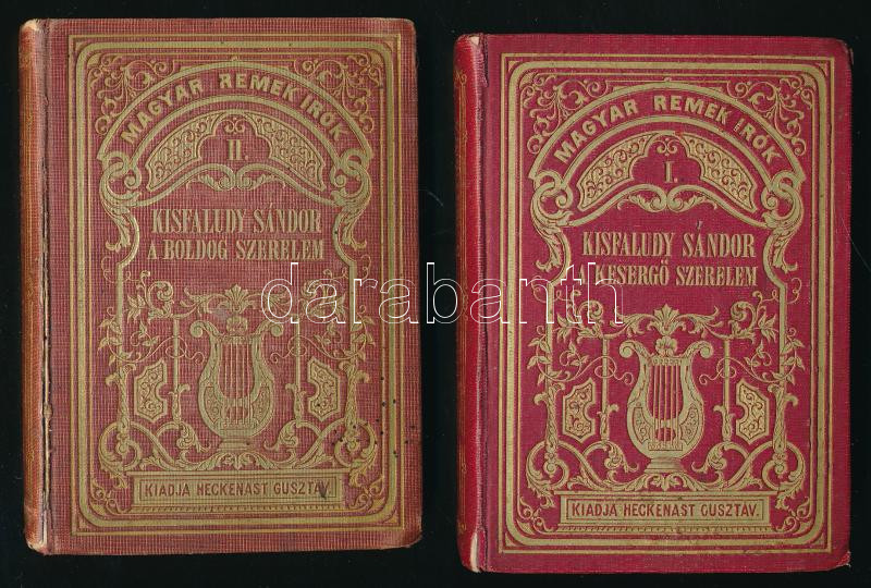 Kisfaludy Sándor: A kesergő szerelem; A boldog szerelem. Magyar Remek Írók I-II. Pest, 1858., Heckenast Gusztáv. Kiadói aranyozott egészvászon-kötés, kopott borítókkal, a II. kötet gerincén sérüléssel.