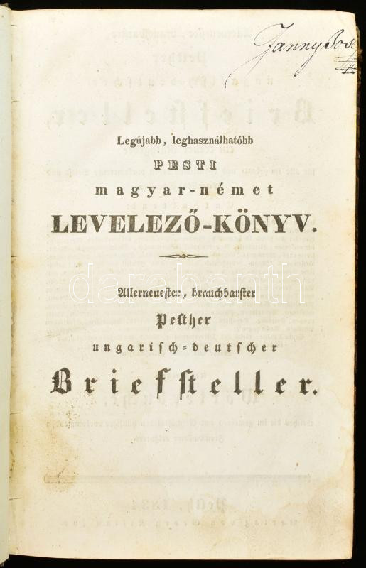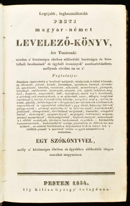 Legújabb, leghasználhatóbb pesti magyar-német levelező-könyv, hív Tanácsadó minden a' közönséges életben előfordúló barátságos és hivatalbeli levelezések' és ügybeli írományok' szerkeztetésében [...] egy szókönyvvel, melly a' közönséges életben és ügyekben előfordúló idegen szavakat magyarázza. Pest, 1834, Ifj. Kilian György (Landerer-ny.), XII+527+(1) p. Magyar és német nyelven. Korabeli, aranyozott, bordázott gerincű félbőr-kötésben, néhány kissé foltos lappal.