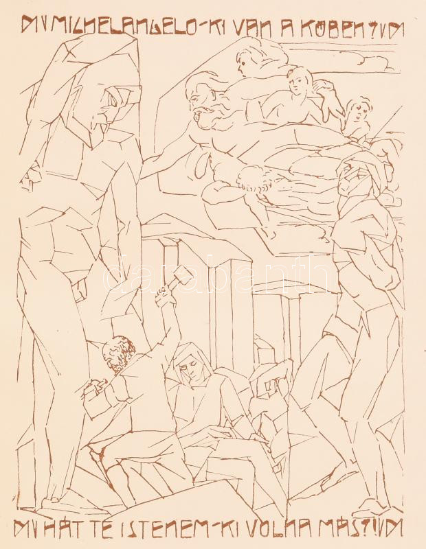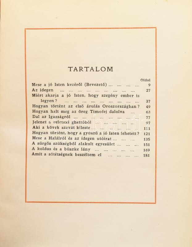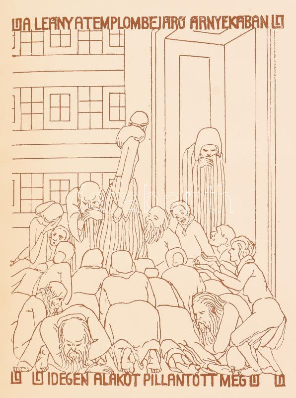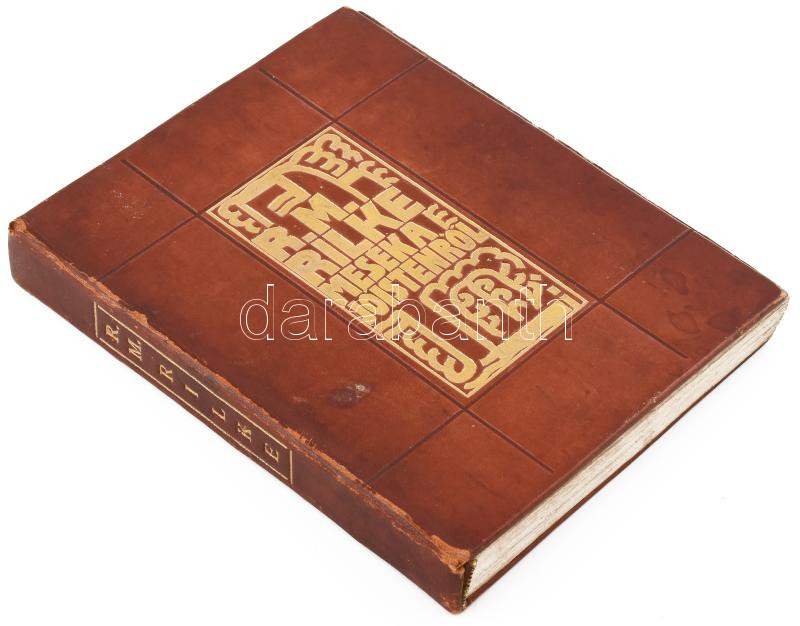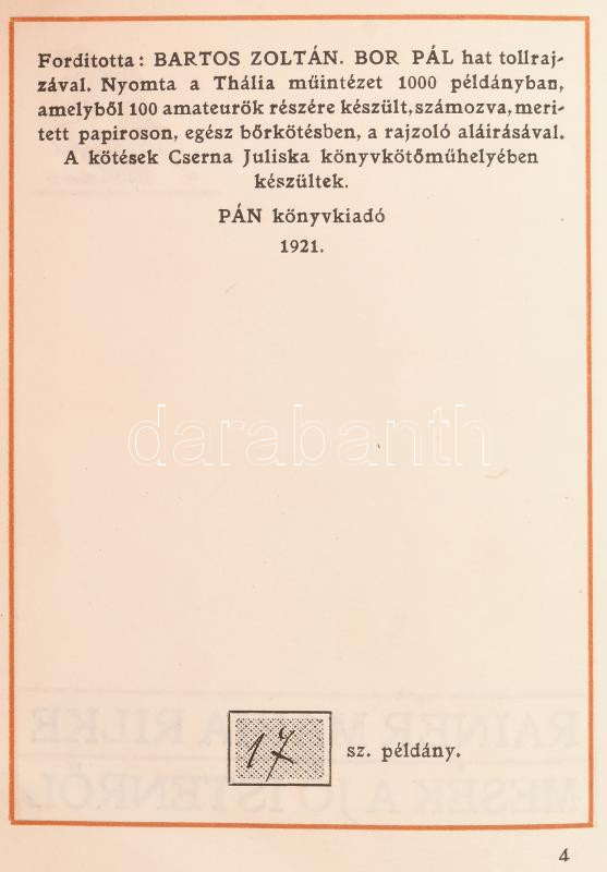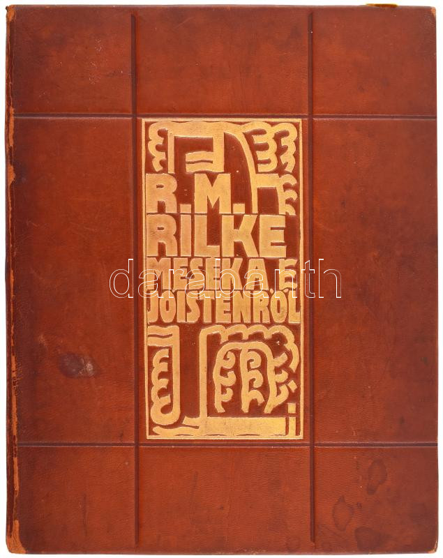 Rainer Maria Rilke: Mesék a jó istenről. Fordította: Bartos Zoltán. Bor Pál hat rajzával illusztrált. Bp., 1921., Pán Könyvkiadó, (Thália-ny.), 200+1 p.+6 t. Kiadói art deco aranyozott egészbőr-kötésben, Cserna Juliska-kötés, a borítón kopásnyomokkal, javított kötéssel. Készült "1000 példányban,amelyből 100 amateurök részére készült, számozva, meritett papíroson, egszbőr-kötésben, a rajzoló aláírásával. A kötések Cserna Juliska könyvműhelyében készültek." Számozott (17./100) példány. A rajzoló aláírása nélkül.