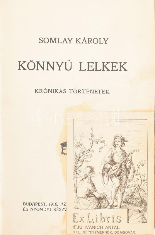 Somlay Károly: Könnyű lelkek. Krónikás történetek. Bp., 1916, Athenaeum, 189+(1) p. Félbőr-kötésben, márványozott lapélekkel, a gerincen némi kopással, apró sérüléssel, a címoldalra ragasztott korabeli ex libris-szel (ifju Ivanich Antal okl. gépészmérnök, Dombóvár).