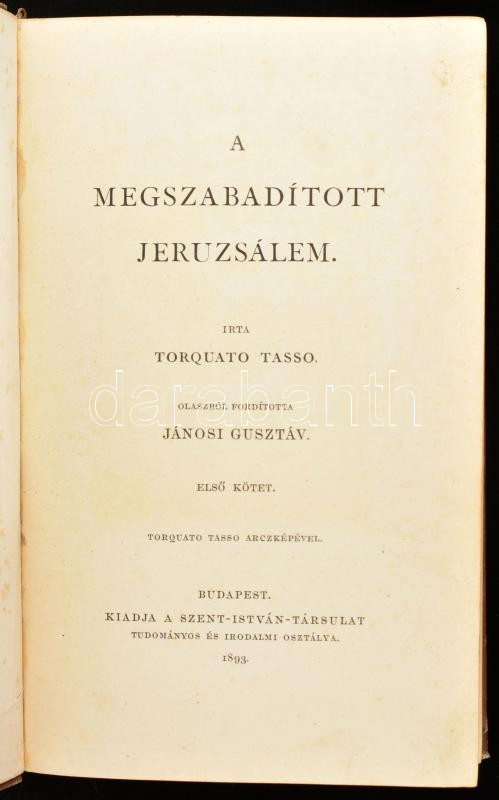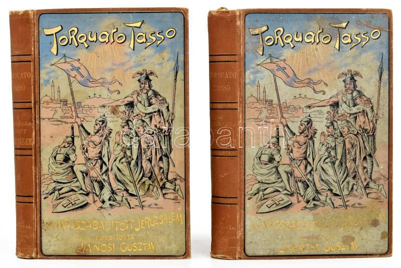 Tasso, Torquato: A megszabadÃtott Jeruzsálem. I-II. köt. Ford.: Jánosi Gusztáv. Bp., 1893, Szent-István-Társulat,(Franklin-ny.), 1 t. +XXV+7+326 p.;331 p. Kiadói aranyozott, festett, illusztrált egészvászon-kötés, Gottermayer-kötés, aranyozott lapélekkel, kopott, foltos borÃtóval, néhány kissé foltos lappal, foxing foltos cÃmképpel.