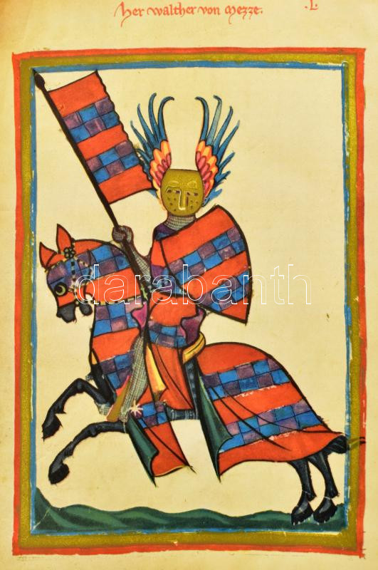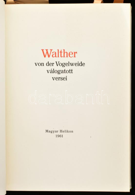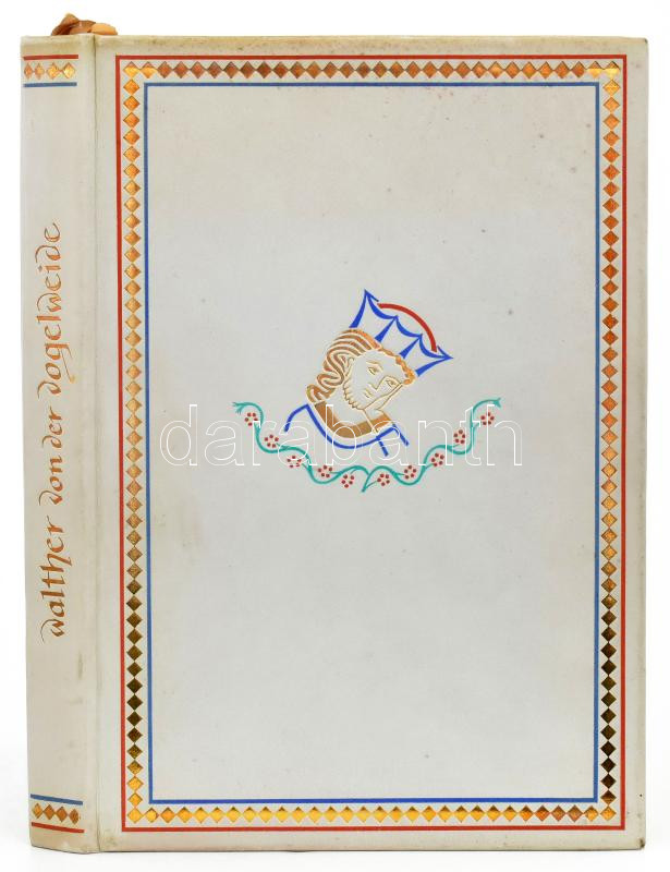 Walther von der Vogelweide válogatott versei. Válogatta, összeállította és az utószót írta: Keresztury Dezső. Vizkelety András jegyzeteivel. Fordították Babits Mihály, Illyés Gyula, Keresztury Dezső, Radnóti Miklós, Szabó Lőrinc, Weöres Sándor és mások. Ford. Bp., 1961., Magyar Helikon,(Gyomai Nyomda (régi Kner-ny.), 196 p.+10 (egészoldalas színes képtáblák) t. Első, számozott, bibliofil kiadás. A tipográfiát és a kötést Haiman György tervezte. Kiadói aranyozott, festett illusztrált egészbőr-kötés, szakadt papír védőborítóban, kissé foltos borítóval, jó állapotban. Számozott (394./900) példány.