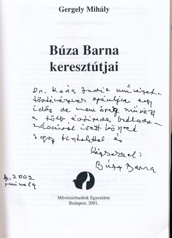 Gergely Mihály: Búza Barna keresztútjai. A művész, Búza Barna (1910-2010) szobrász, éremművész által Koós Judit (1923-2006) művészettörténész, műkritikus részére DEDIKÁLT példány. Bp., 2001., Művészetbarátok Egyesülete. Kiadói papírkötés.