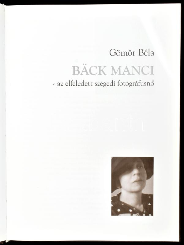 Gömör Béla: Bäck Manci - az elfeledett szegedi fotográfusnő. Bp, 2003, GMR Reklámügynőkség. Fekete-fehér képekkel illusztrálva. Kiadói kartonált papírkötésben, a borító sarkánál kis gyűrődéssel, egyébként jó állapotban