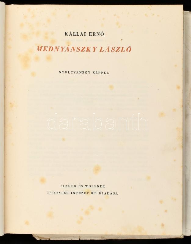 Kállai Ernő: Mednyánszky László. Bp., 1943, Singer és Wolfner. Gazdag képanyaggal illusztrált. Kiadói egészvászon-kötés, kissé kopott borítóval, kissé foltos lapokkal, az eredeti szétszakadt papírborító a könyvben van.