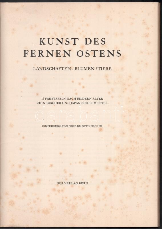 Kunst des Fernen Ostens. Landschaften, Blumen, Tiere. Prof. Dr. Otto Fischer bevezetésével. Iris Bücher. Kiadta: Hans Zbinden. Bern, 1935, Iris Verlag, 10+1 p.+XV t. Német nyelven. Kiadói kartonált papÃrkötés, a gerincen kis sérüléssel. / Paperbinding, with little damaged in the spine, in German language.