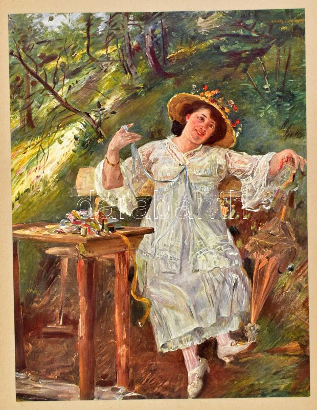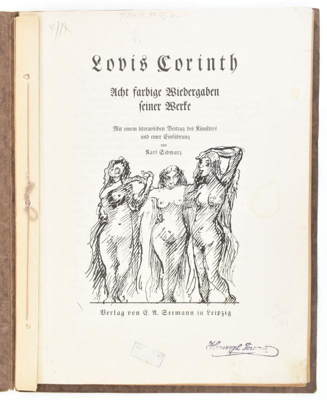 Lovis Corinth. Acht farbige Wiedergaben seiner Werke. Mit einem literarischen Beitrag des Künstlers und iner Einführung von Karl Schwarz. E. A. Seemanns Künstlermappen 42. Leipzig, é.n., E. A. Seemann, 4 sztl. lev. + 8 t. Egészoldalas, színes reprodukciókkal. Német nyelven. Kiadói zsinórfűzéses papírkötés, kissé foltos lapokkal, tulajdonosi névbélyegzővel.
