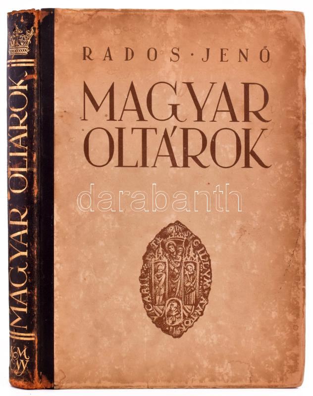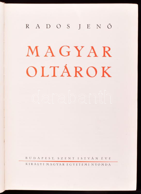 Rados Jenő: Magyar oltárok. Bp., 1938, Kir. M. Egyetemi Nyomda, 93+(2) p.+CLXXI t.+(2) p. Gazdag szövegközi és egészoldalas, fekete-fehér képanyaggal illusztrált. Kiadói aranyozott gerincű félbőr-kötés, kopottas borítóval és gerinccel.
