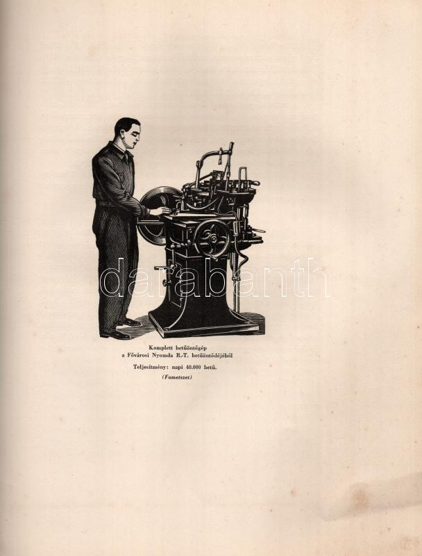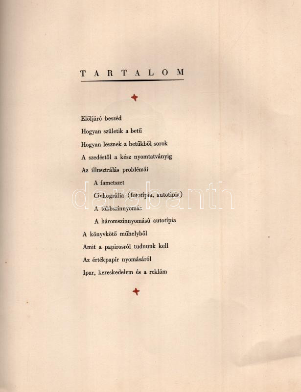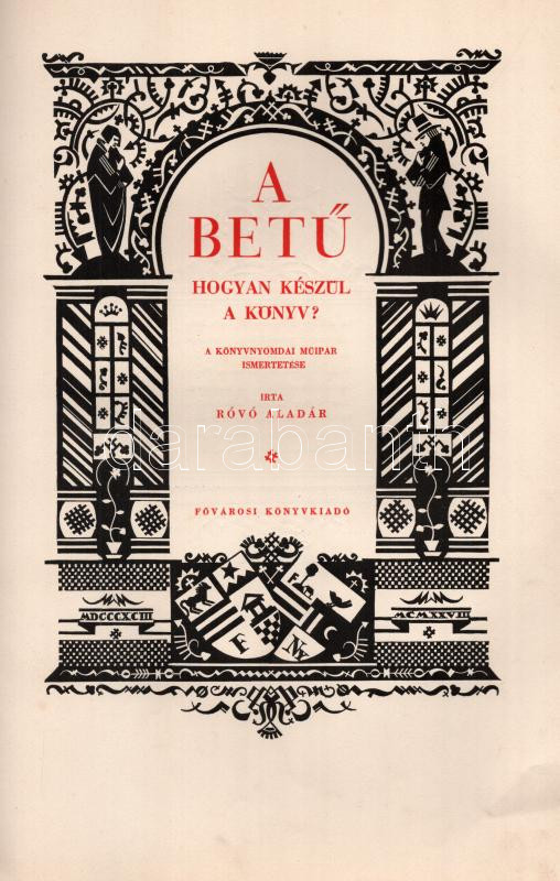 Rovó Aladár: A betű. Hogyan készül a könyv? A könyvnyomdai műipar ismertetése. Bp., [1929], Fővárosi Könyvkiadó (Fővárosi Nyomda Rt.), 108+(4) p. A fejléceket és iniciálékat Galambos Margit festőművész rajzolta. Papírkötésben, kissé sérült, kopottas borítóval, helyenként kissé foltos lapokkal.