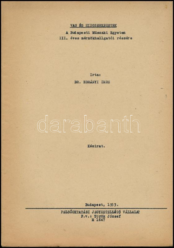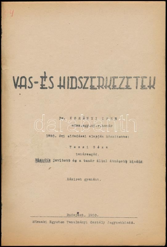 Tassi Géza: Vas- és hídszerkezetek. Dr. Korányi Imre 1950. évi előadási alapján készítette: - - . (Kézirat gyanánt). Bp., 1950, Műszaki Egyetem Tanulmányi Osztály Jegyzetkiadó. Papírkötésben. + Dr. Korányi Imre: Vas és hídszerkezetek. A Budapesti Műszaki Egyetem III. éves mérnökhallgatói részére. (Kézirat). Bp., 1953, Felsőoktatási Jegyzetellátó Vállalat, 37 p. Kiadói tűzött papírkötés.