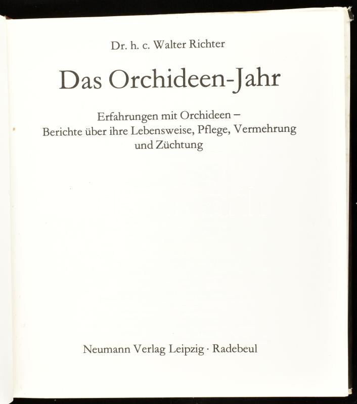 Walter Richter: Das Orchideen-Jahr. Leipzig-Radebeul, 1988, Neumann Verlag. SzÃnes fotókkal illusztrálva. Német nyelven. Kiadói egészvászon-kötés, kissé sérült kiadói papÃr védÅ‘borÃtóban.