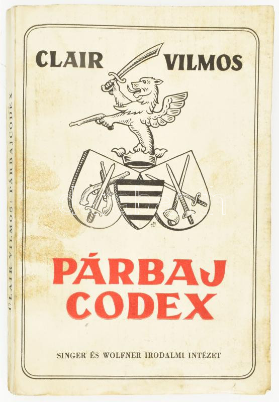 Leírás: Clair Vilmos: Párbaj-codex. Bp.,én., Singer és Wolfner. Egészoldalas fotókkal illusztrált. Kiadói papírkötés, foltos borítóval.