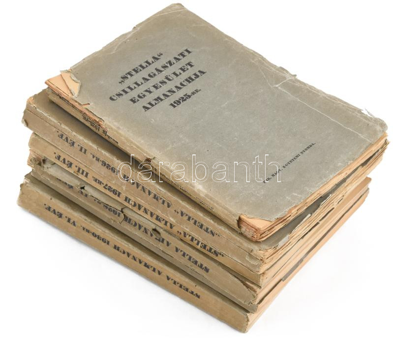 1925-1930 "Stella" Csillagászati Egyesület almanachja 1925-re, 1926-ra, 1927-re, 1928-ra, 1929-re, 1930-ra. I-VI. évf. Szerk.: Tass Antal és Wodetzky József. Bp., 1924-1930., Kir. M. Egyetemi Nyomda. Kiadói papírkötések, három borító sérült, szakadozott, kettő kötése sérült, szétvált.