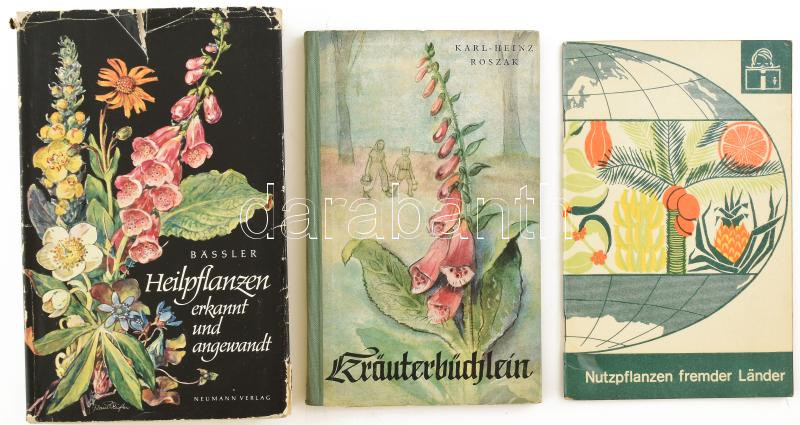 3 db német nyelvű, növényekkel kapcsolatos könyv: Friedrich A. Bässler: Heilpflanzen erkannt und angewandt; Karl-Heinz Roszak: Kräuterbüchlein; Walter Vent: Nutzpflanzen fremder Länder. Vegyes állapotban.