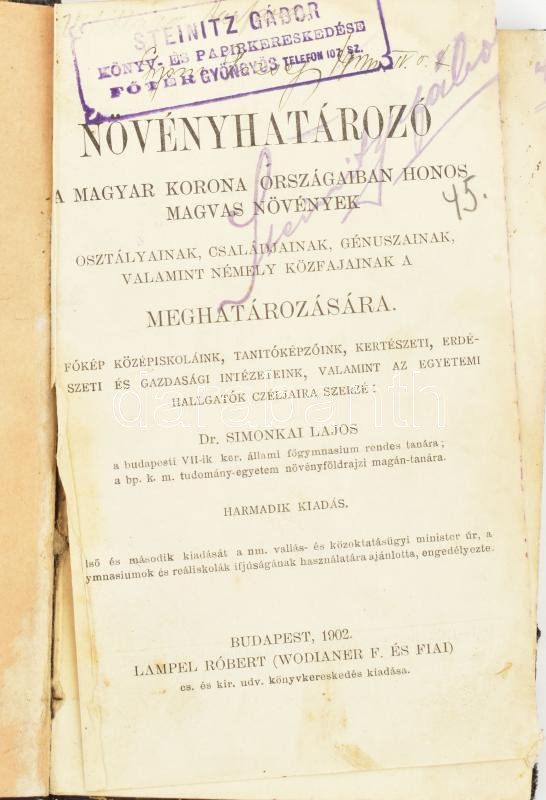 Dr. Simonkai Lajos: Növényhatározó a magyar korona országaiban honos magvas növények osztályainak, családjainak, génuszainak, valamint némely közfajainak a meghatározására. Bp., 1902, Lampel Róbert (Wodianer F. és Fiai), VIII+195+(1) p. Harmadik kiadás. Korabeli viseltes félvászon-kötésben, márványozott lapélekkel, sérült borítóval, a fűzéstől elváló címlappal, tulajdonosi névbejegyzésekkel és bélyegzőkkel.