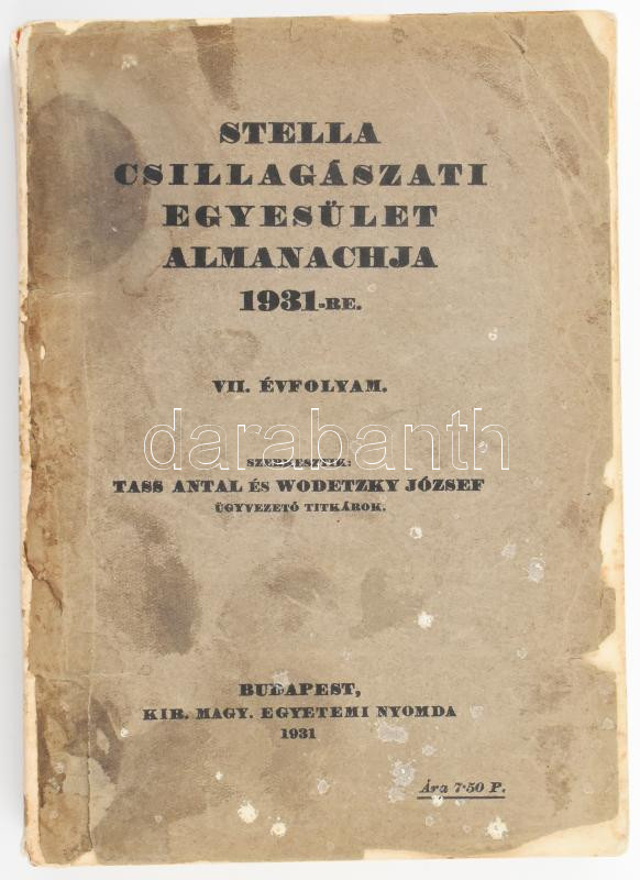 Stella Csillagászati Egyesület almanachja 1931-re. VII. évfolyam. Szerk.: Tass Antal és Wodetzky József. Bp., 1931, Kir. M. Egyetemi Nyomda, IX+424 p. Kiadói papírkötés, sérült, hiányos borítóval, pótolt gerinccel.