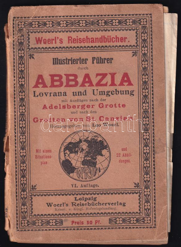 Leírás: Woerl, Leo: Illustrierter Führer durch Abbazia, Lovrana und Umgebung. Woerl's Reisehandbücher. Leipzig, é.n. (cca 1910), Woerl's Reisebücher-Verlag. Fekete-fehér képekkel, hirdetésekkel, egy kihajtható térképpel. Német nyelven. Kiadói papírkötés, sérült borítóval.