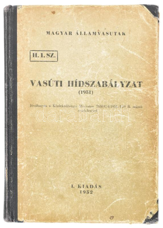 Vasúti hídszabályzat (1951). Magyar Államvasutak. Bp., 1952, Közlekedésügyi Minisztérium I. Vasúti Főosztálya (Szikra-ny.), 328 p. Első kiadás. Kiadói félvászon-kötés, kissé sérült, kopott borítóval, helyenként ceruzás ill. tollas bejegyzésekkel.