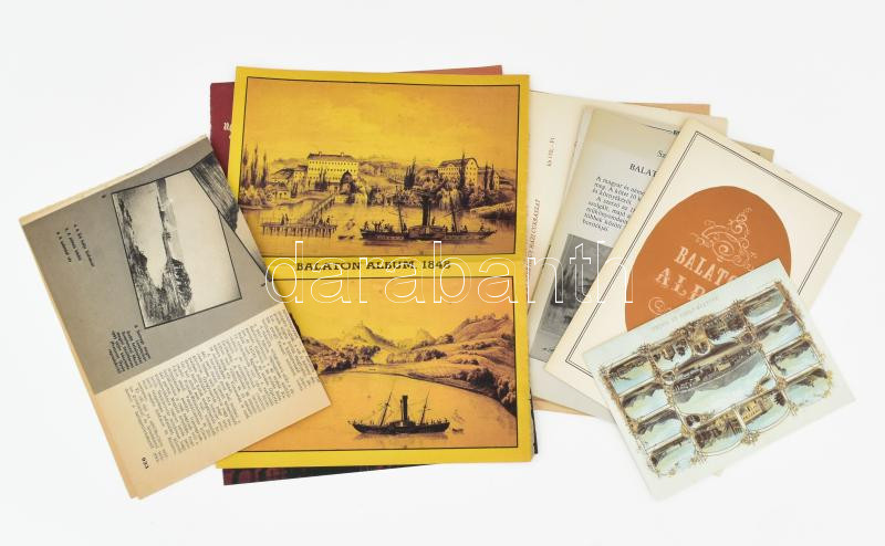 1931-1980 Vegyes Balatonnal kapcsolatos újságcikk gyűjtemény, 7 db. + Valamint az ÁKV reprint sorozatának prospektusai, közte a Balaton Albumra vonatkozó. Valamint 1 modern Balatonos képeslap.