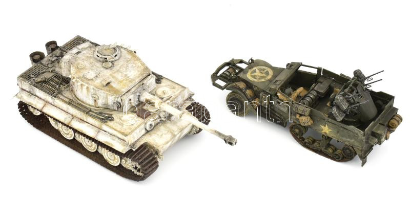 2 db II. világháborús harcjármű makett: Tigris (Pz.Kpfw VI Tiger) tank és amerikai M3 féllánctalpas jármű (légvédelmi gépágyúval felszerelve). Részletgazdag, festett műanyag. Sérült, lejáró darabokkal, h: 19 - 24 cm