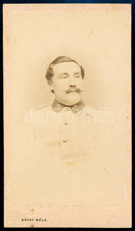 Leírás: 1864 Katonatiszt portréja, keményhátú fotó Gévay Béla pesti műterméből, 10,5×6 cm