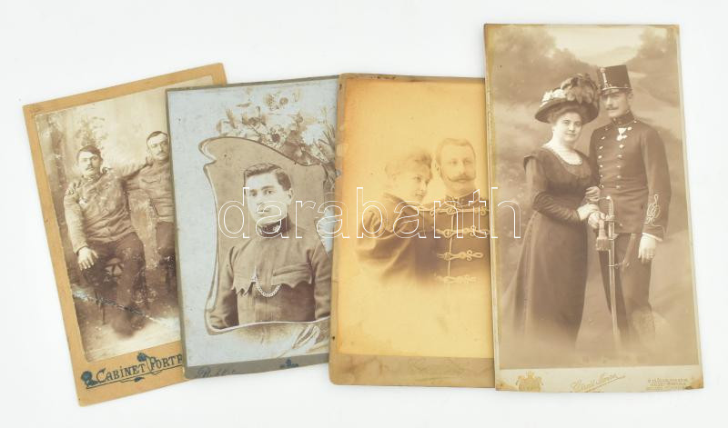 Leírás: Régi katonaportrék, 4 db keményhátú kabinetfotó, vegyes állapotban, 16,5x11 cm és 20x11 cm között