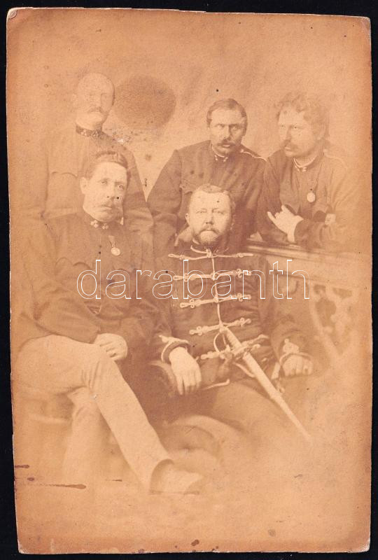 Leírás: cca 1900 Katonák csoportképe, kettejük kitüntetéssel dekorált, keményhátú fotó, jelzés nélkül, kopott, foltos, 17x11,5 cm.