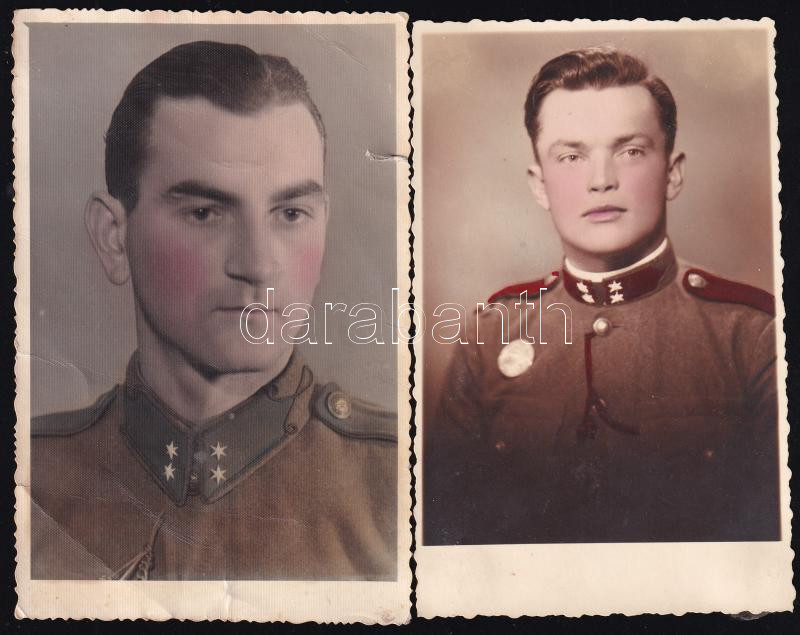 Leírás: cca 1942 Katonaportrék, 2 db színezett fotó, felültén törésnyomok, 13×8 cm