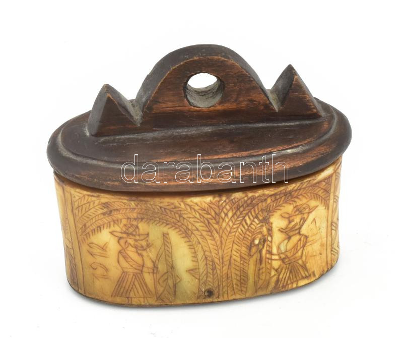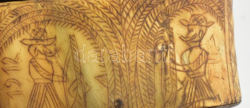 Leírás: 1912 Zsír tartó. Vadászjelenetekkel díszített csont, fa fedéllel 9x5 cm