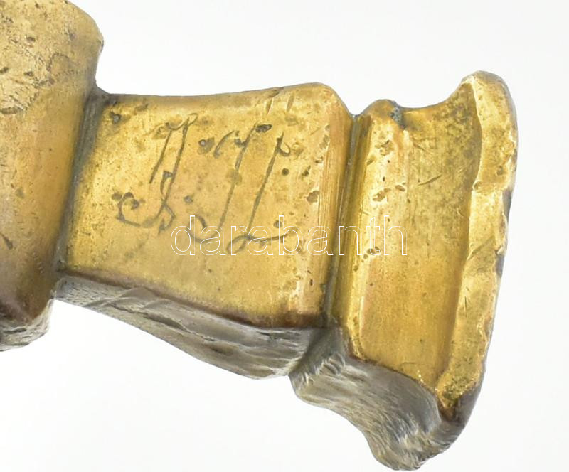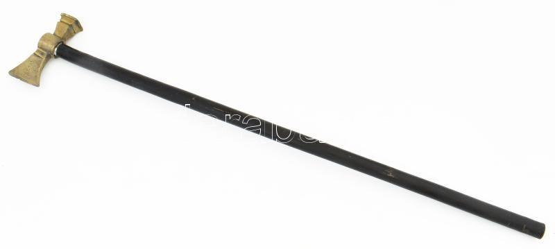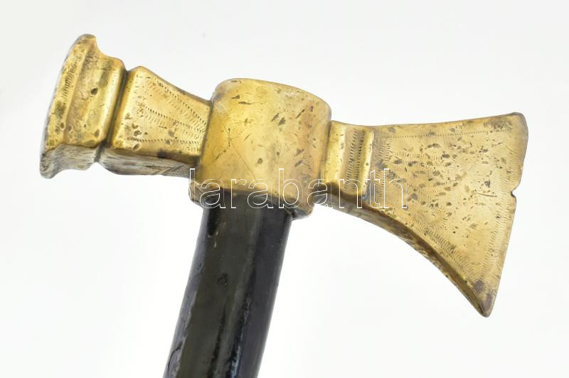 Fokos, fanyeles ütő-vágó fejű sárgaréz fokos.XIX. sz. Tompa ütőfej szélesség 4 x 4 cm, vágóél hossz 7 cm. A fokos felülete kis karcolt vonalkákkal díszített. A fejrészre JIL nagybetűs monogramot véstek. 84 cm