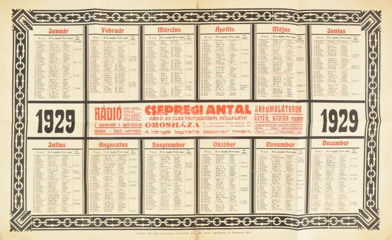 Leírás: 1929 Orosháza, Csepregi Antal rádió és elektrotechnikai vállalata, falinaptár, hajtott, szakadással, 42×67 cm