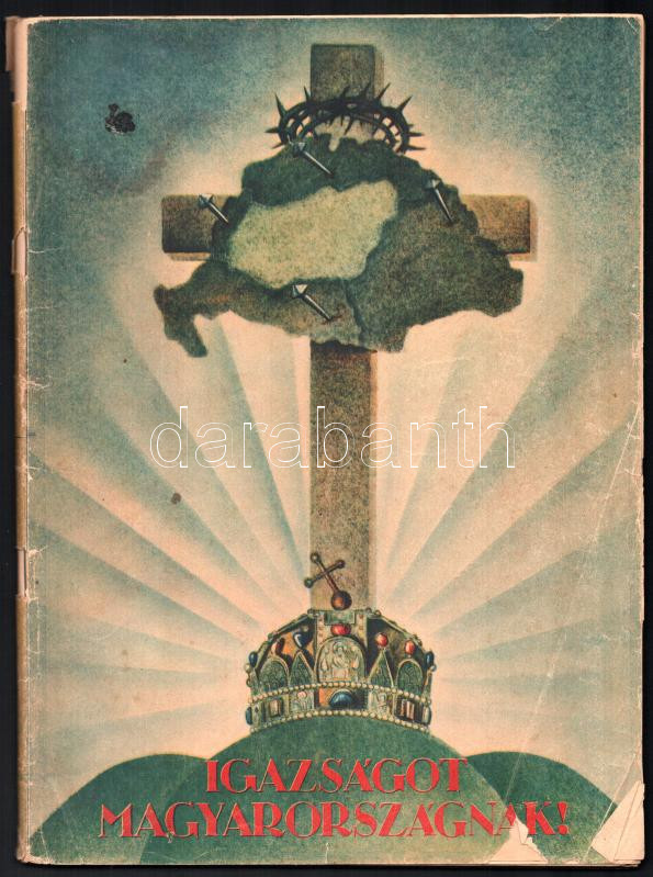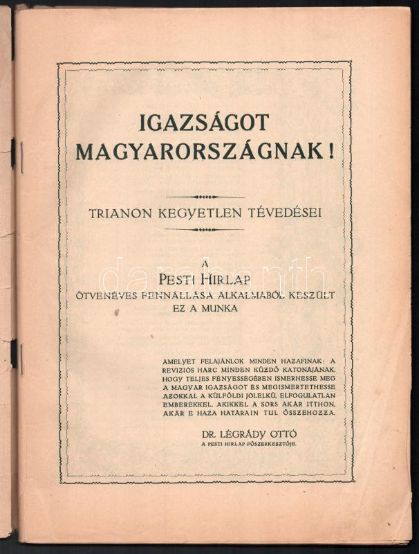 cca 1928 Igazságot Magyarországnak! Trianon kegyetlen tévedései. A Pesti Hírlap ötvenéves fennállása alkalmából. Szerk.: Légrády Ottó. Irredenta kiadvány, gazdag képanyaggal, térképekkel, érdekes írásokkal. 150 p. Tűzött papírkötés, sérült borítóval,