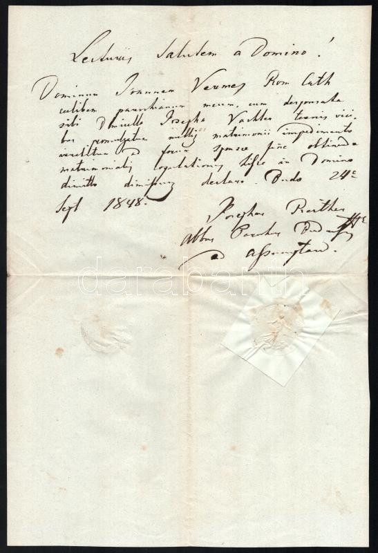 Leírás: 1848 Buda, egyházi házassági engedély, papírfelzetes viaszpecséttel