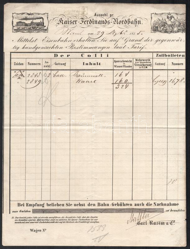 1855 Bécs (Wien), német nyelvű fuvarlevél Pestre (Kaiser-Ferdinand-Nor... https://www.darabanth.com/hu/444-Gyorsarveres/444.0/Mutargy-papirregiseg-egyeb/Okmanyok~500022/1855-Becs-Wien-nemet-nyelvu-fuvarlevel-Pestre-Kaiser-Ferdinand-Nordbahn~II2889159