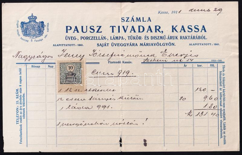 Leírás: 1911 Kassa, Pausz Tivadar porcelánkereskedő, üveggyáros fejléces számlája