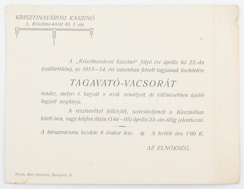 1913-1914 Krisztinavárosi Kaszinó tagavató-vacsorájának meghívója https://www.darabanth.com/hu/444-Gyorsarveres/444.0/Mutargy-papirregiseg-egyeb/Okmanyok~500022/1913-1914-Krisztinavarosi-Kaszino-tagavato-vacsorajanak-meghivoja~II2903929