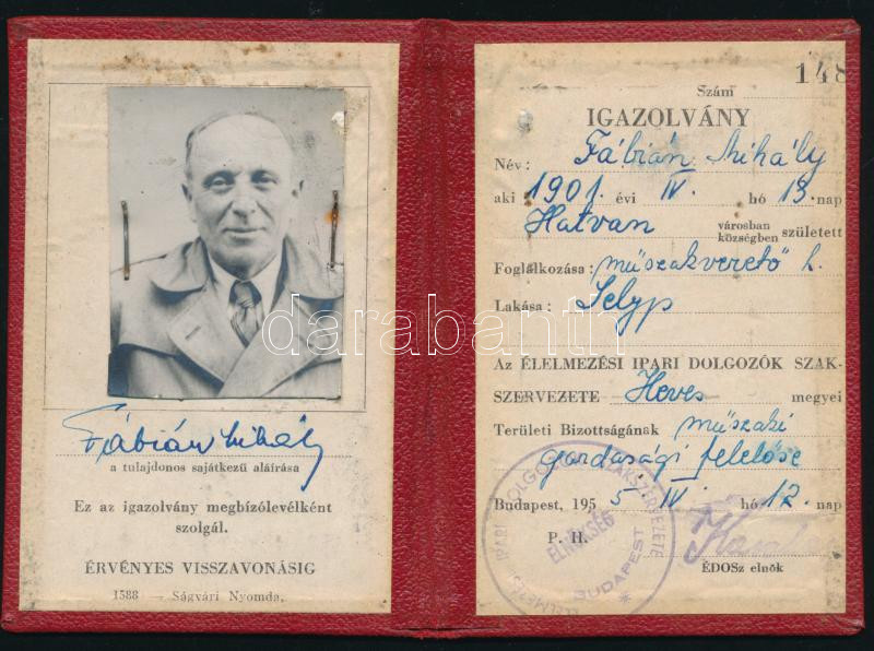 1955 Az Élelmezési Dolgozók Szakszervezete arcképes igazolvány https://www.darabanth.com/hu/444-Gyorsarveres/444.0/Mutargy-papirregiseg-egyeb/Okmanyok~500022/1955-Az-Elelmezesi-Dolgozok-Szakszervezete-arckepes-igazolvany~II2932759