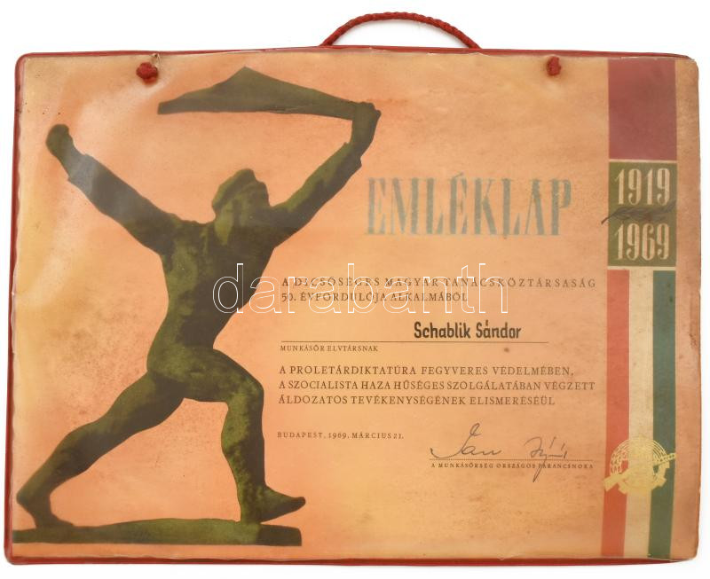 1969 Schablik Sándor tanácsköztársasági forradalmár, munkásőr parancsnok részére kiállított emléklap a Tanácsköztársaság 50. évfordulója alkalmából, Munkásőrség országos parancsnoka aláírásával, műanyag borítóban, falra akasztható műanyag tokban, műanyag tok elülső fele szakadással, 21x29 cm /