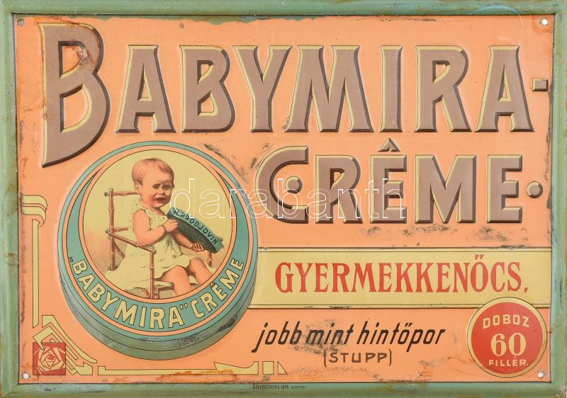 Leírás: Babymira Créme gyermekkenőcs fém reklámtábla, Bruchsteiner & Sohn Budapest, kopásnyomokkal, 23,5×33 cm