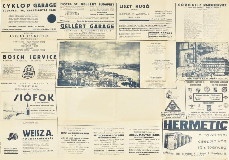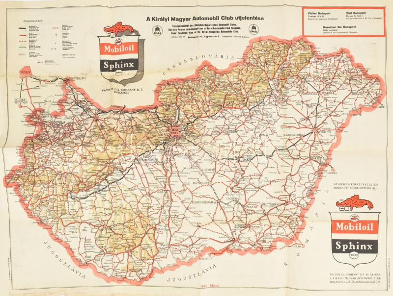 1933 A Királyi Magyar Automobil Club utjelentése (Magyarország autótérképe). Bp., Litogr. Gottlieb. Mobiloil Sphinx - Vacuum Oil Company Rt. reklámmal, hátoldalán különféle hirdetésekkel. Kisebb lapszéli sérülésekkel, 69x49 cm