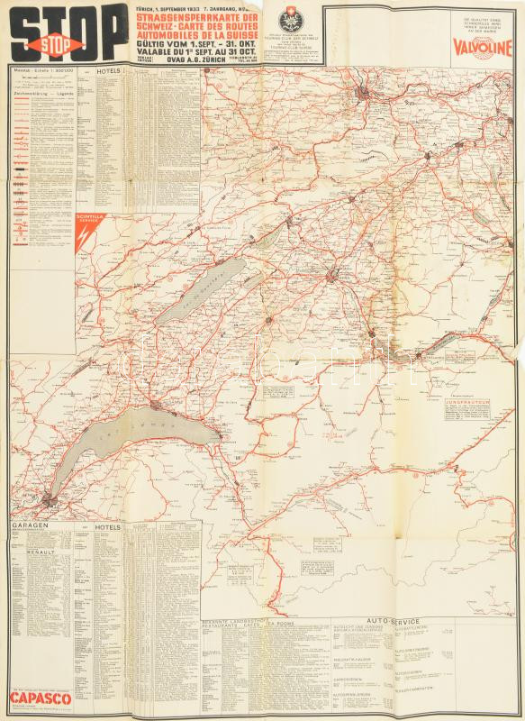1933 Strassensperrkarte der Schweiz / Svájc autótérképe, 1 : 300.000, ... https://www.darabanth.com/hu/444-Gyorsarveres/444.0/Mutargy-papirregiseg-egyeb/Terkepek~1500002/1933-Strassensperrkarte-der-Schweiz-Svajc-autoterkepe-1-300000-ketoldalas-nehany-kis-~II2931608