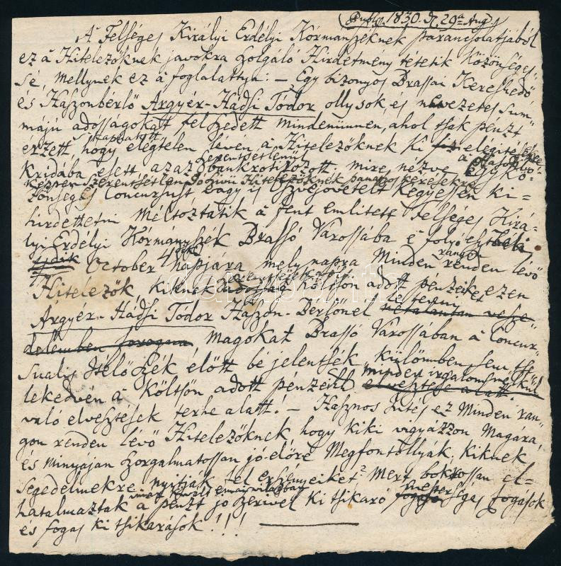 1830 Hirdetmény a ,,Felséges Királyi Erdélyi Kormányszék parancsolatából", Árgyér-Hádfi Tódor brassói kereskedő pórul járt hitelezőinek ügyében, kézirat egy oldalon