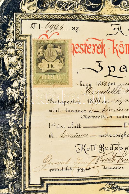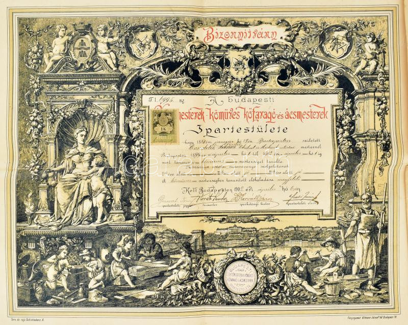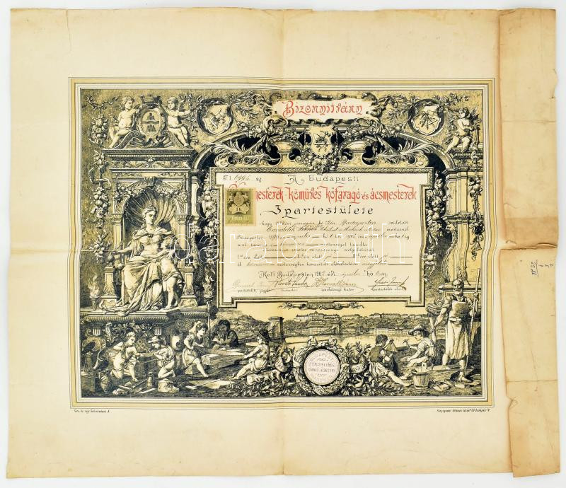 1902 Oszvaldik Gyula (1884-?) műépítész (Pl Dunakeszi Szent Mihály templom építésze) kőműves mesteri bizonyítványa. Nagy méretű dekoratív oklevél 55x66 cm Kis szakadással hajtva