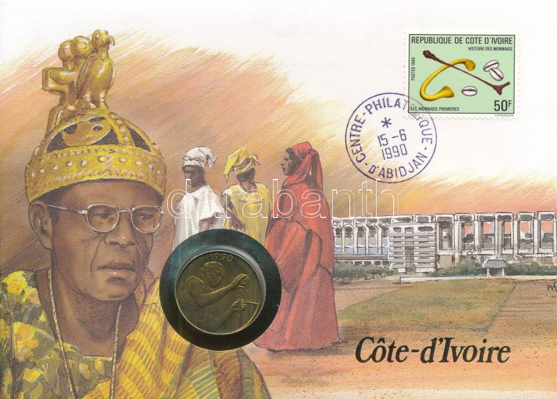 Elefántcsontpart felbélyegzett borítékban, bélyegzéssel, benne Nyugat Afrikai Államok 1990. 25Fr, német nyelvű leírással T:UNC Ivory Coast in envelope with stamp and cancellation, in it West African States 1990. 25 Francs with German language description C:UNC