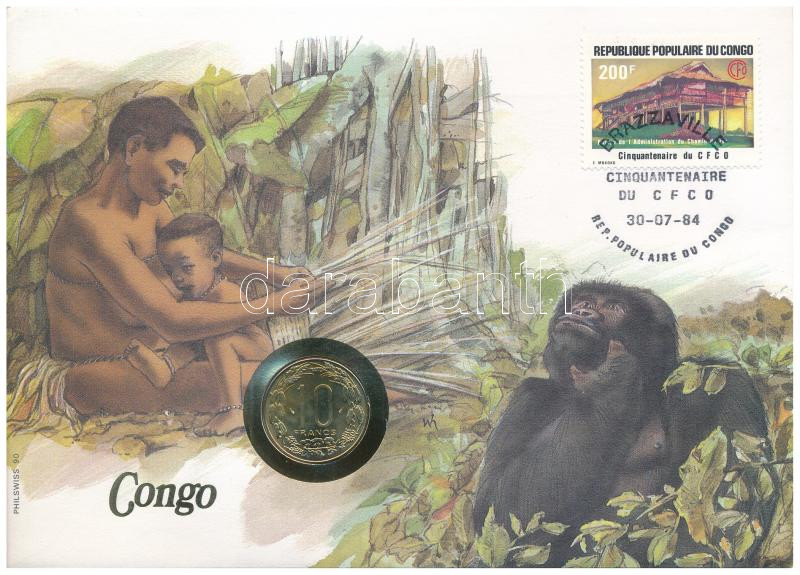 Kongó felbélyegzett borítékban, bélyegzéssel, benne Nyugat Afrikai Államok 1983. 10Fr, német nyelvű leírással T:UNC Congo in envelope with stamp and cancellation, in it West African States 1983. 10 Francs with German language description C:UNC