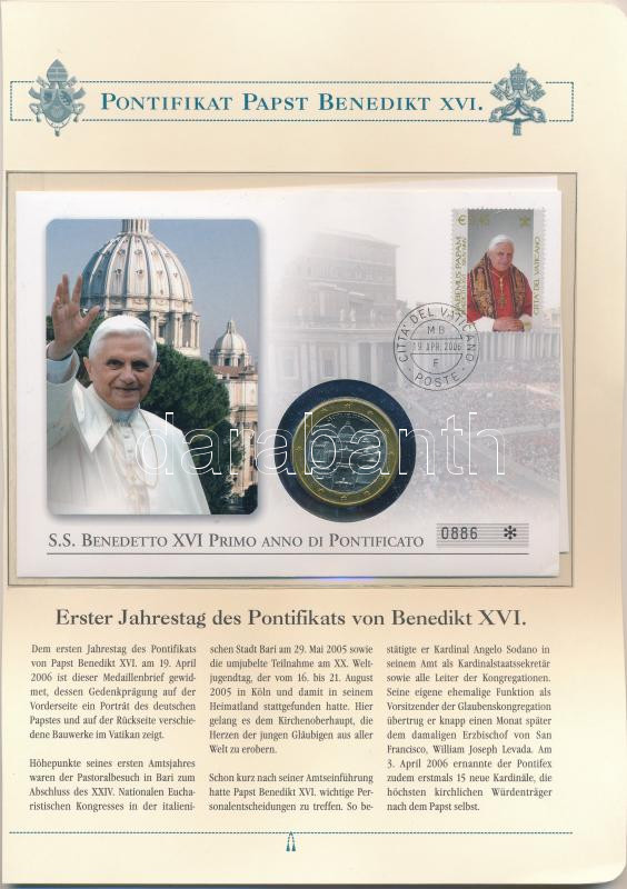Vatican 2006. "The first year of Pope Benedict XVI 's pontificate" commemorative medallion in serial numbered envelope with stamp, first day cancellation and with a large information sheet in German C:UNC